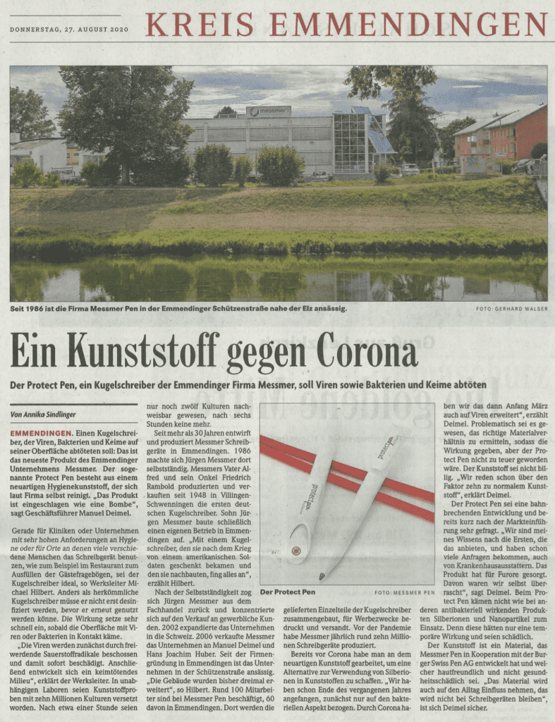24. August 2021 By messmerpen Pressemitteilungen BZ – Ein Kunststoff gegen Corona Auszug aus der Badischen Zeitung vom 27.08.2020